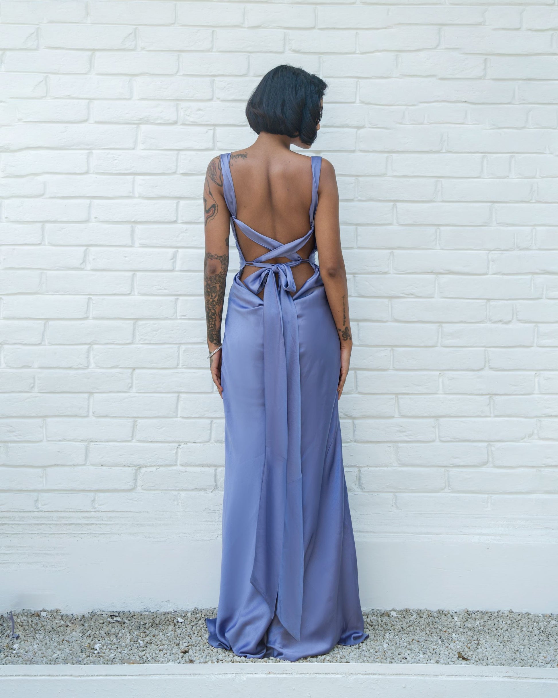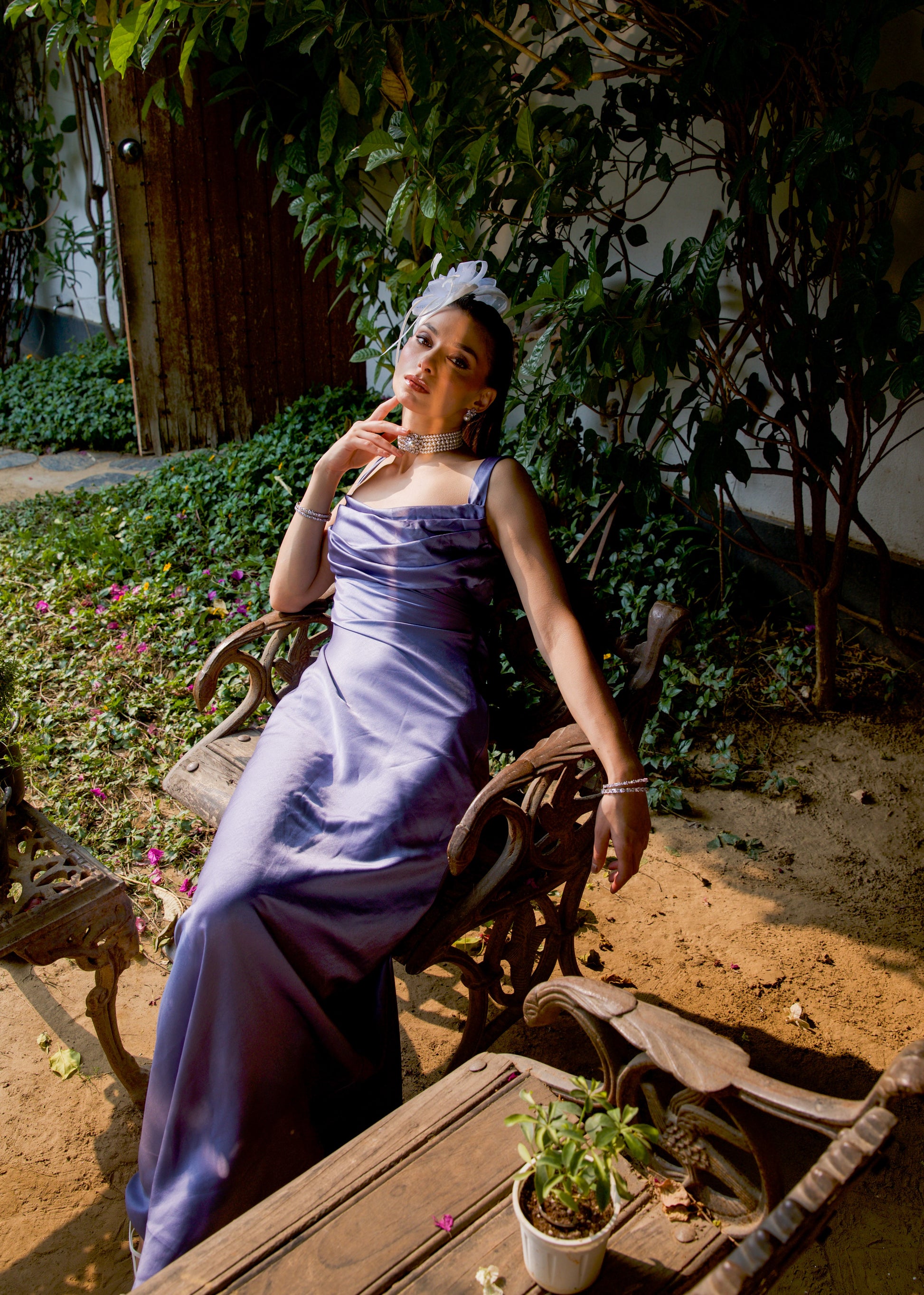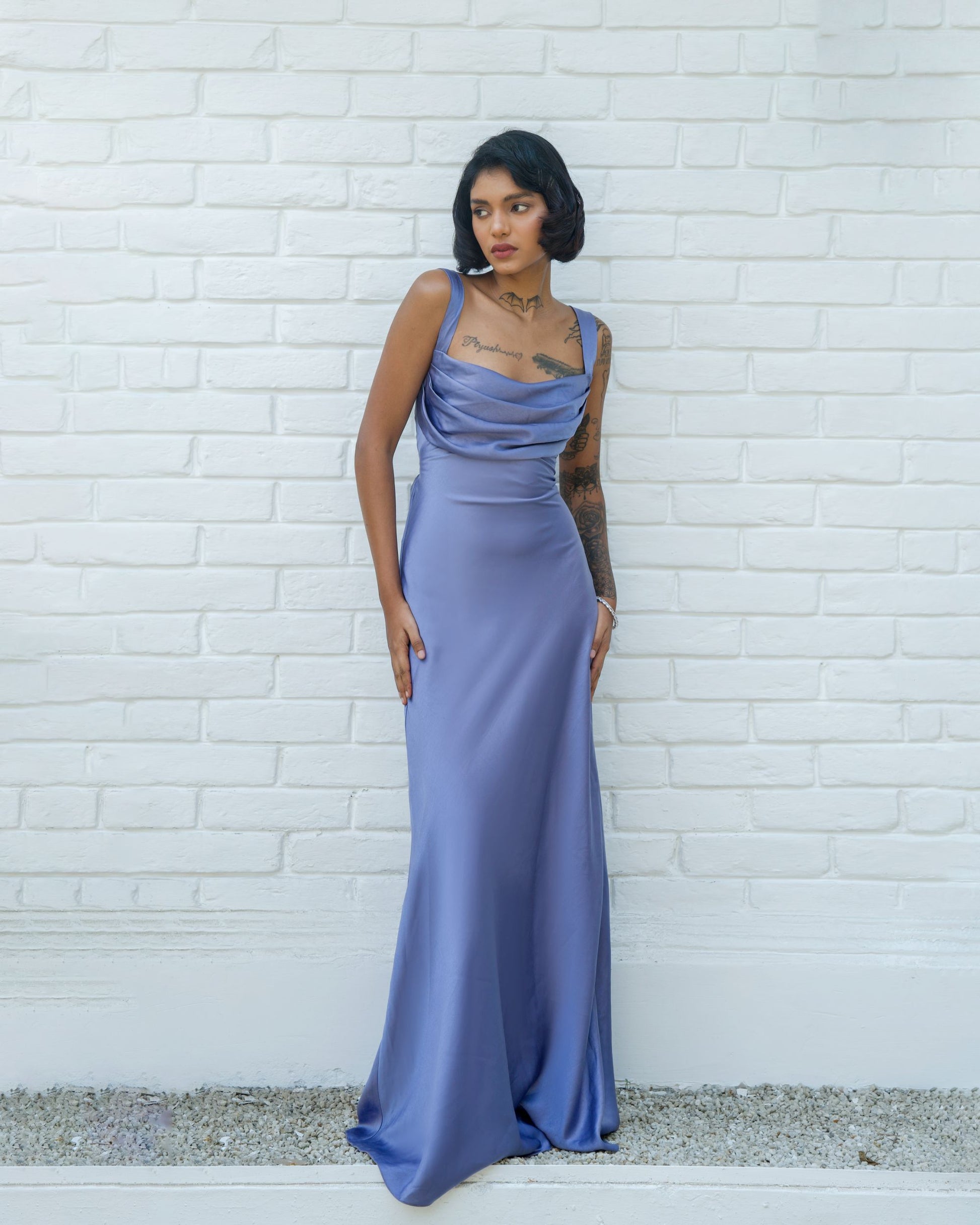 Soft and alluring, the Amethyst Whisper is a full-length lavender satin dress that radiates understated elegance. This beautiful gown features a graceful cowl square neckline, adding depth and flow to the bodice. The delicate straps cross at the open back in an intricate criss-cross design, creating a captivating silhouette from every angle.