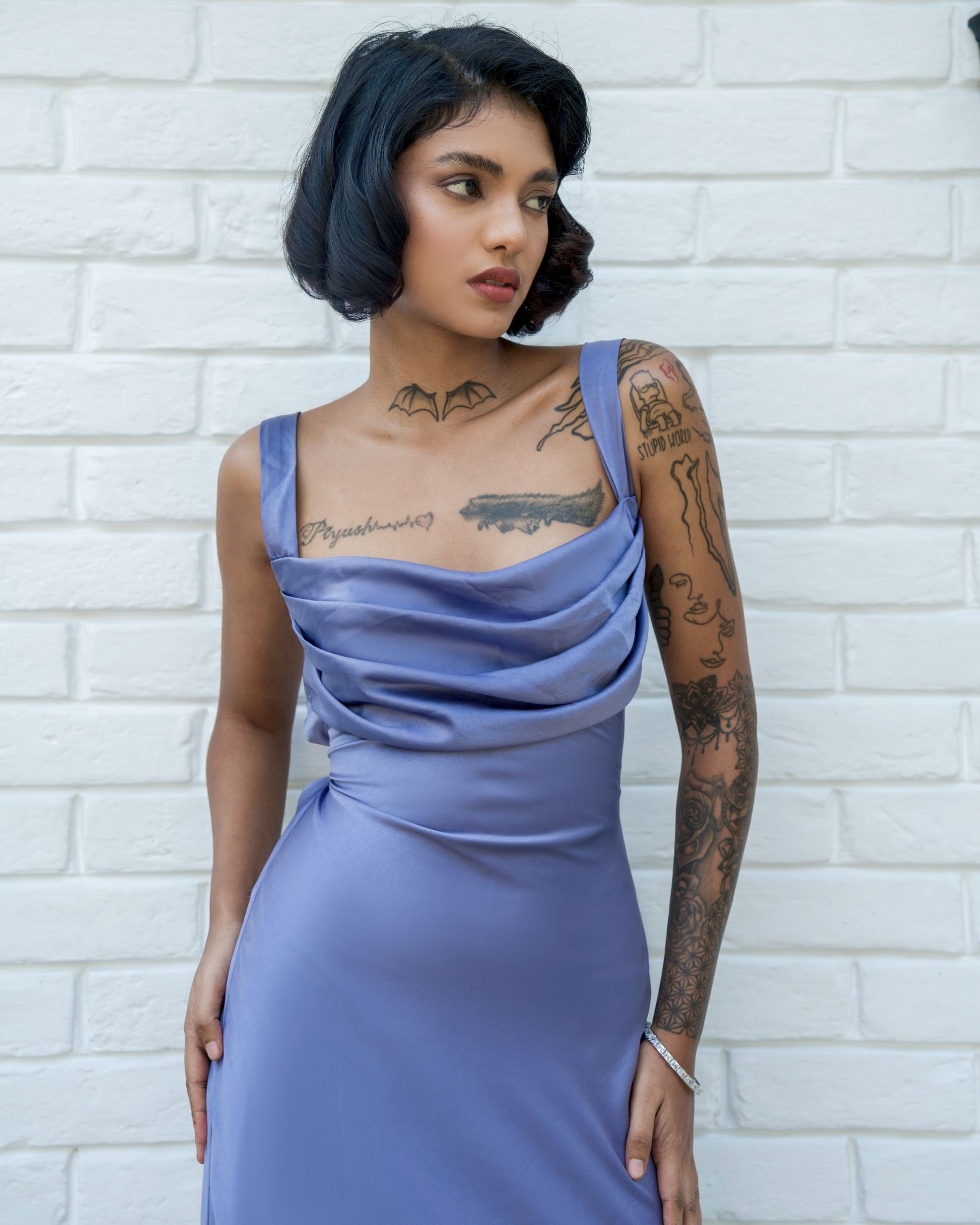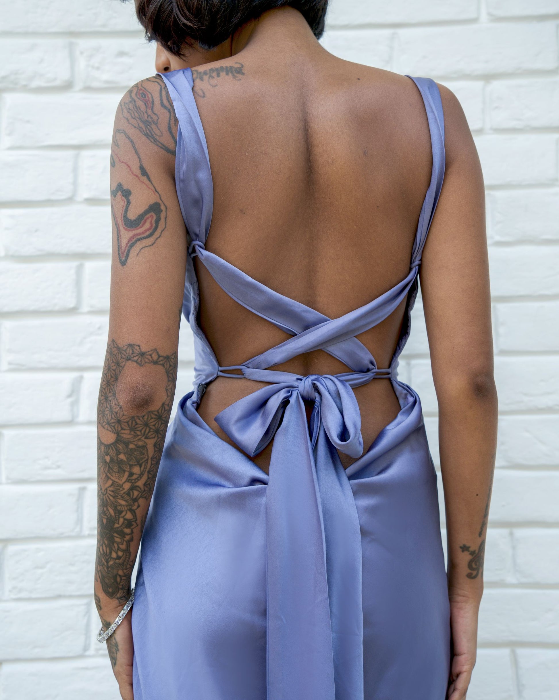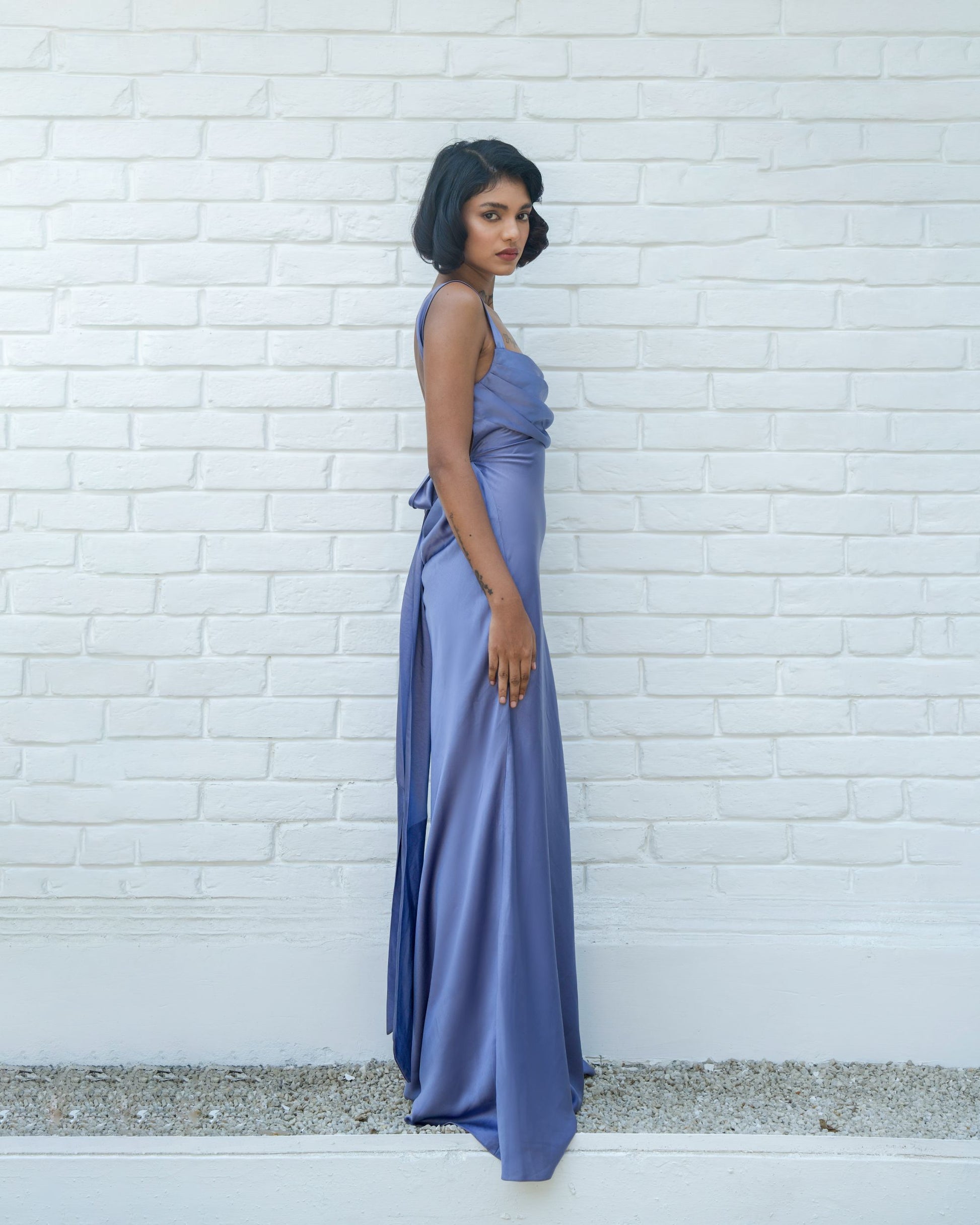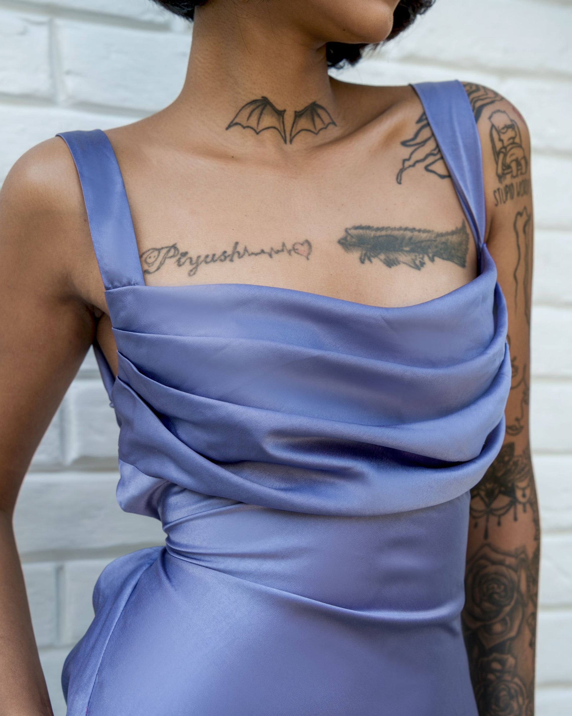 Soft and alluring, the Amethyst Whisper is a full-length lavender satin dress that radiates understated elegance. This beautiful gown features a graceful cowl square neckline, adding depth and flow to the bodice. The delicate straps cross at the open back in an intricate criss-cross design, creating a captivating silhouette from every angle.
